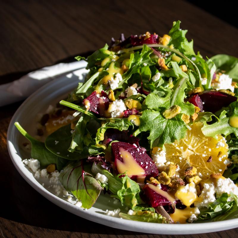 Baby kale, red beets, walnut crumble, goat cheese, orange-vanilla vinaigrette • Add Grilled or Crispy Chicken, or Blackened Shrimp +$8.00 | Add 8 oz. Pub Steak +$12.00